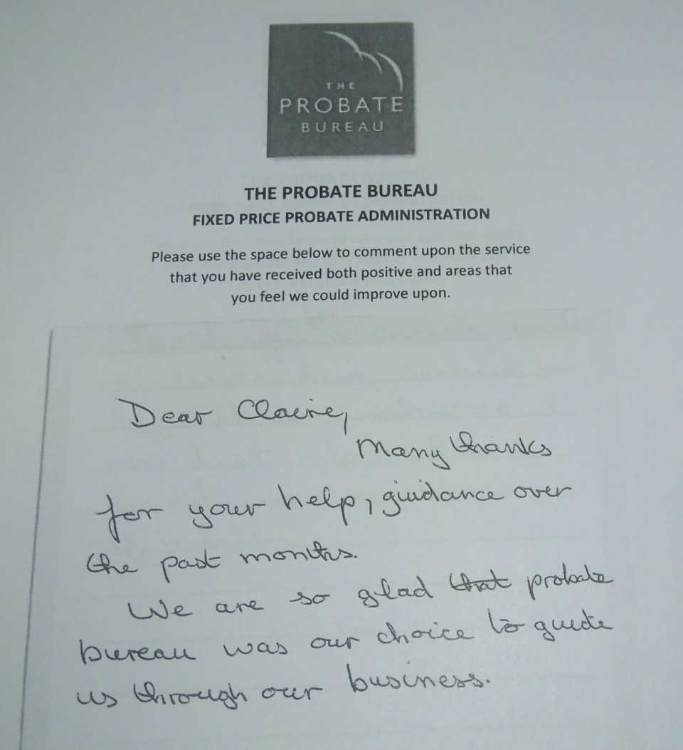 xxx and I want to express our thanks to you and your firm for all the work which you carried out for us in the administration of our mother's estate. We know it's your job and you do this all the time, but we felt we had to say how impressed we have been with the work The Probate Bureau do and in particular how you, yourself have dealt with us. nothing has been too much trouble and you have always taken time to talk, even though you must have many other people to deal with.