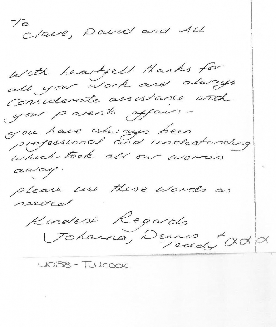 Thank you all so very much for the way you have handled John's estate for me, in such a sensitive and efficient manner. Where would we have been without David, James and yourself guiding us through officialdom and wading through the masses of paperwork, the assets and liabilities.